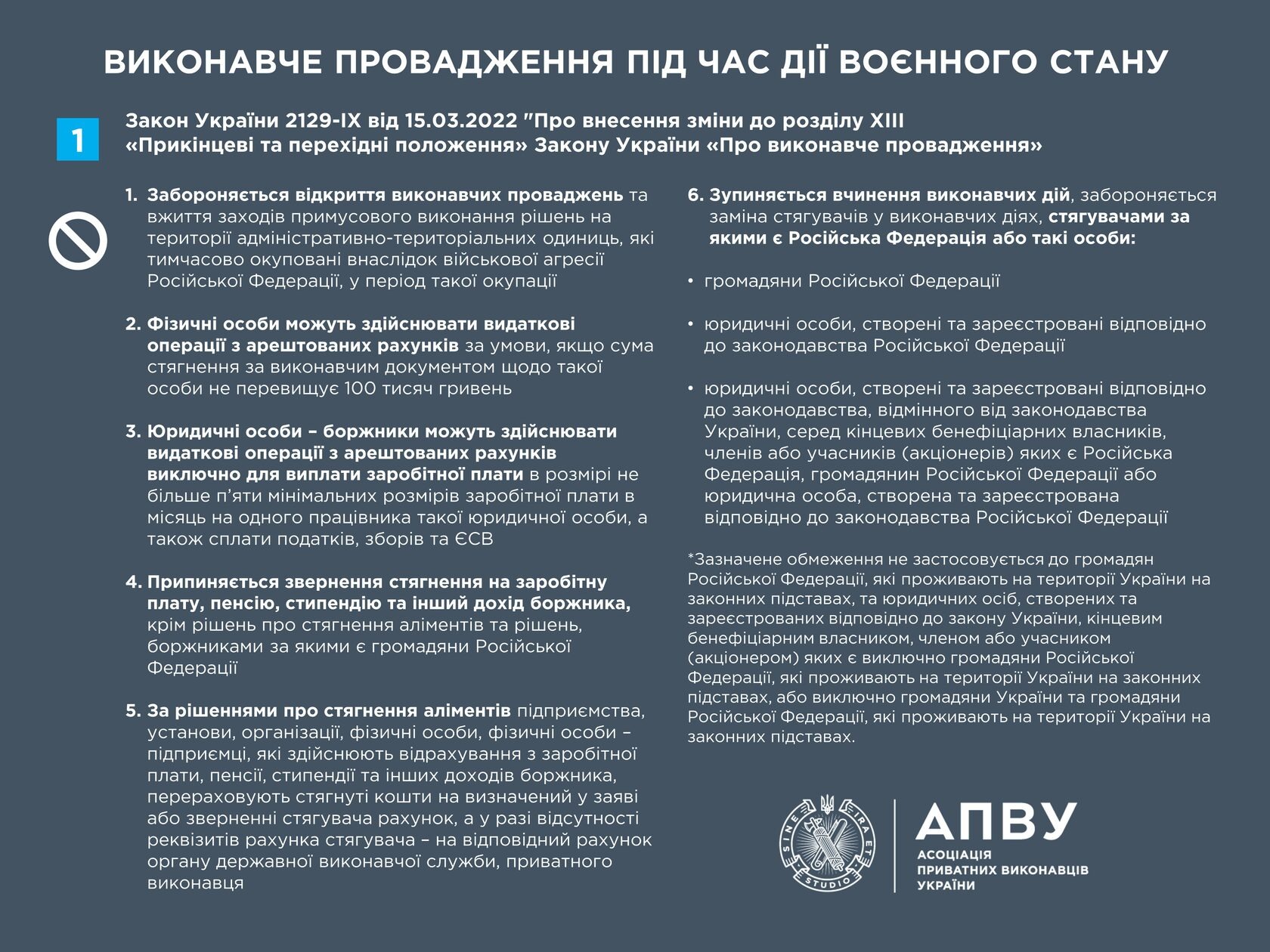 Секретаріат АПВУ зібрав ключові нормативні зміни, які визначатимуть роботу у сфері виконання рішень в Україні під час війни, і передав їх у зручній інфографіці.