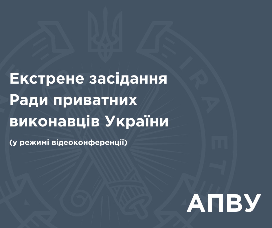 Екстрене засідання Ради приватних виконавців України відбудеться 23 листопада 2020 року о 10.00 в режимі вiдеоконференцiї (відповідно п. 6.15 Статуту АПВУ).
