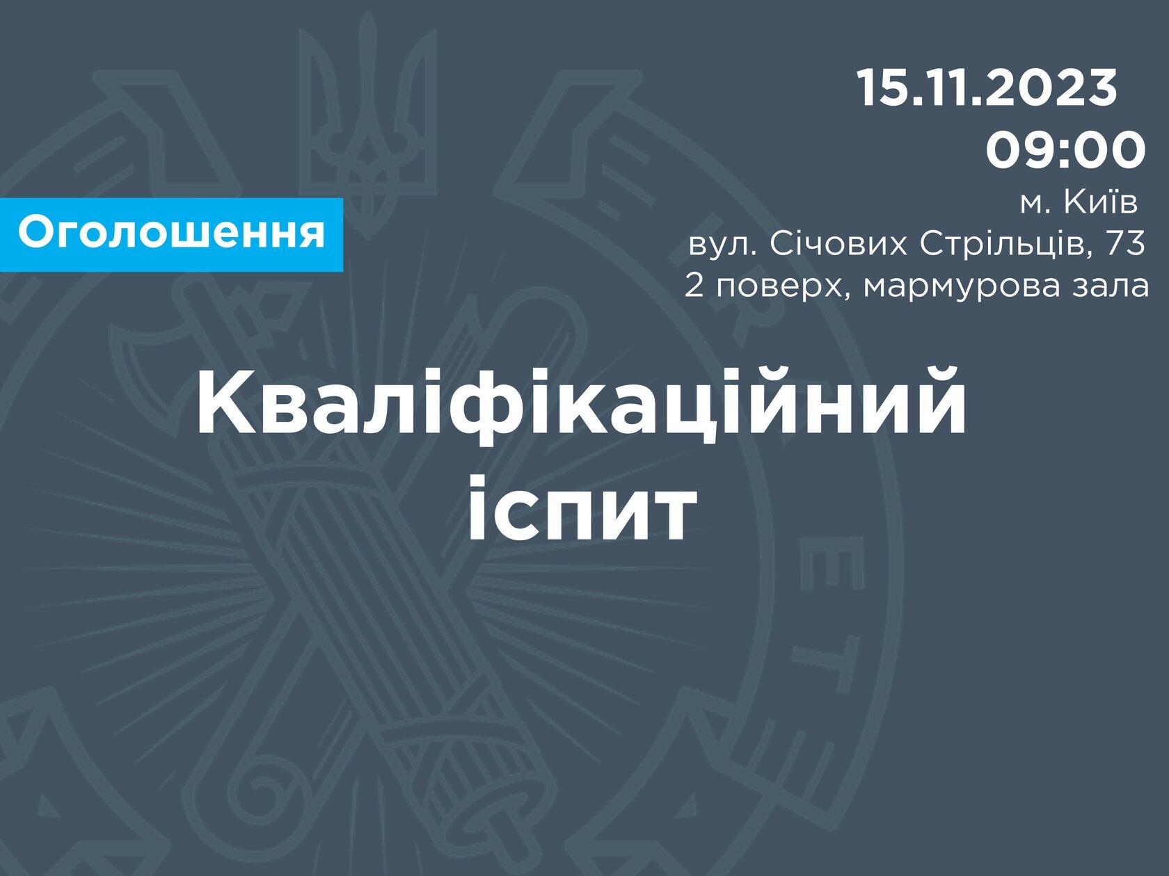 Дата і час проведення іспиту – 15.11.2023, початок іспиту о 9 год. 00 хв.
