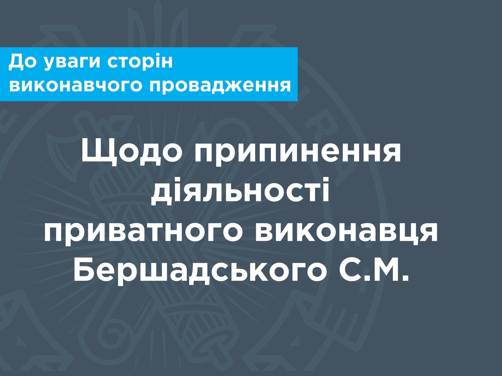 Наказом Міністерства юстиції України №1786/5 від 11.05.2023 припинено діяльність приватного виконавця виконавчого округу Кіровоградської області Бершадського С.М.