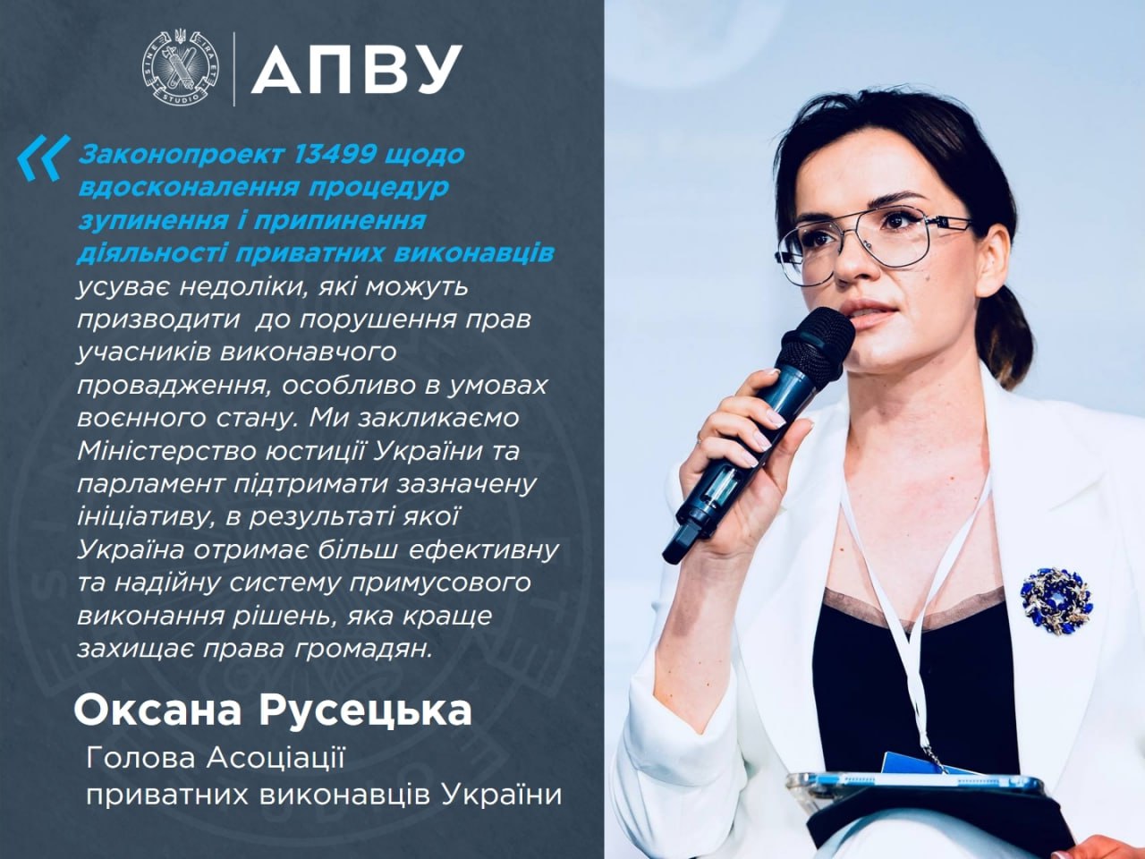 «Законопроект розроблено на основі аналізу реальних проблем. Він усуває недоліки, які можуть призводити до порушення прав учасників виконавчого провадження, особливо в умовах воєнного стану та вирішує низку проблемних питань та відсутності належного законодавчого врегулювання на стадії заміщення приватних виконавців, які були виявлені протягом останніх років діяльності та набули особливого значення під час запровадження воєнного стану в Україні. Ми дякуємо народним депутатам за увагу до сфери примусово виконання рішень та закликаємо Міністерство юстиції України та парламент підтримати зазначену ініціативу. Як результат Україна отримає більш ефективну та надійну систему примусового виконання судових рішень, яка краще захищає права громадян України та сприяє належному виконанню рішень судів», – зажначила Голова АПВУ Оксана Русецька.