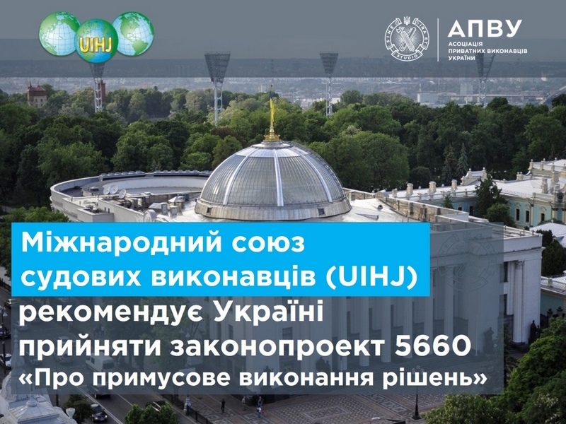 Асоціація приватних виконавців України щиро дякує закордонним партнерам UIHJ за солідарну позицію і наголошує на необхідності прийняття законопроекту №5660 «Про примусове виконання рішень» для оптимальної процедури інтеграції української системи правосуддя на шляху вступу до Європейського Союзу.