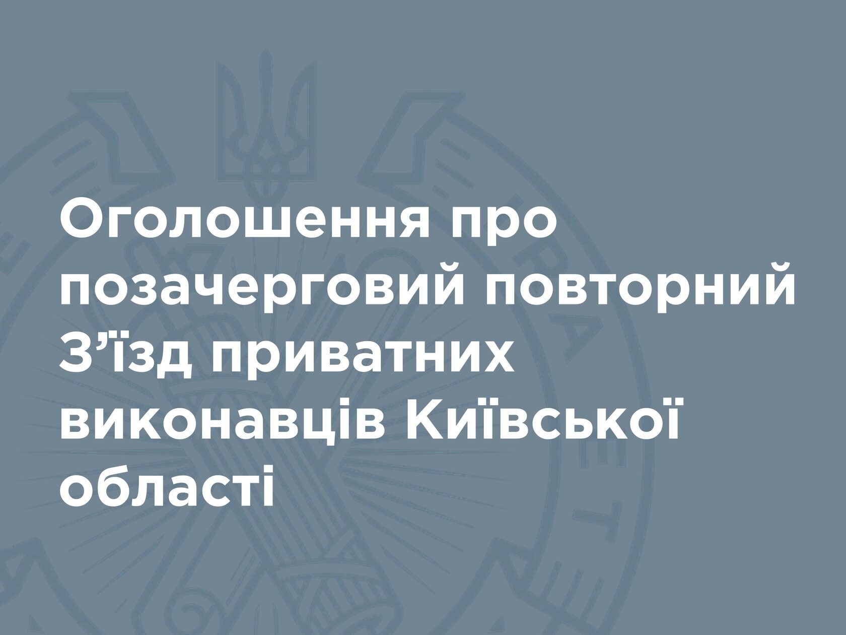 Приватні виконавці виконавчого округу Київської області: Трофименко М.М., Крегул І.І., Ніколаєв С.В., Ніколаєнко І.Р., Протченко Б.О., які разом складають більше 10 % від загальної кількості приватних виконавців, офіс яких розташований у Київській області, повідомляють про скликання позачергового повторного З’їзду приватних виконавців регіону (Київської області).