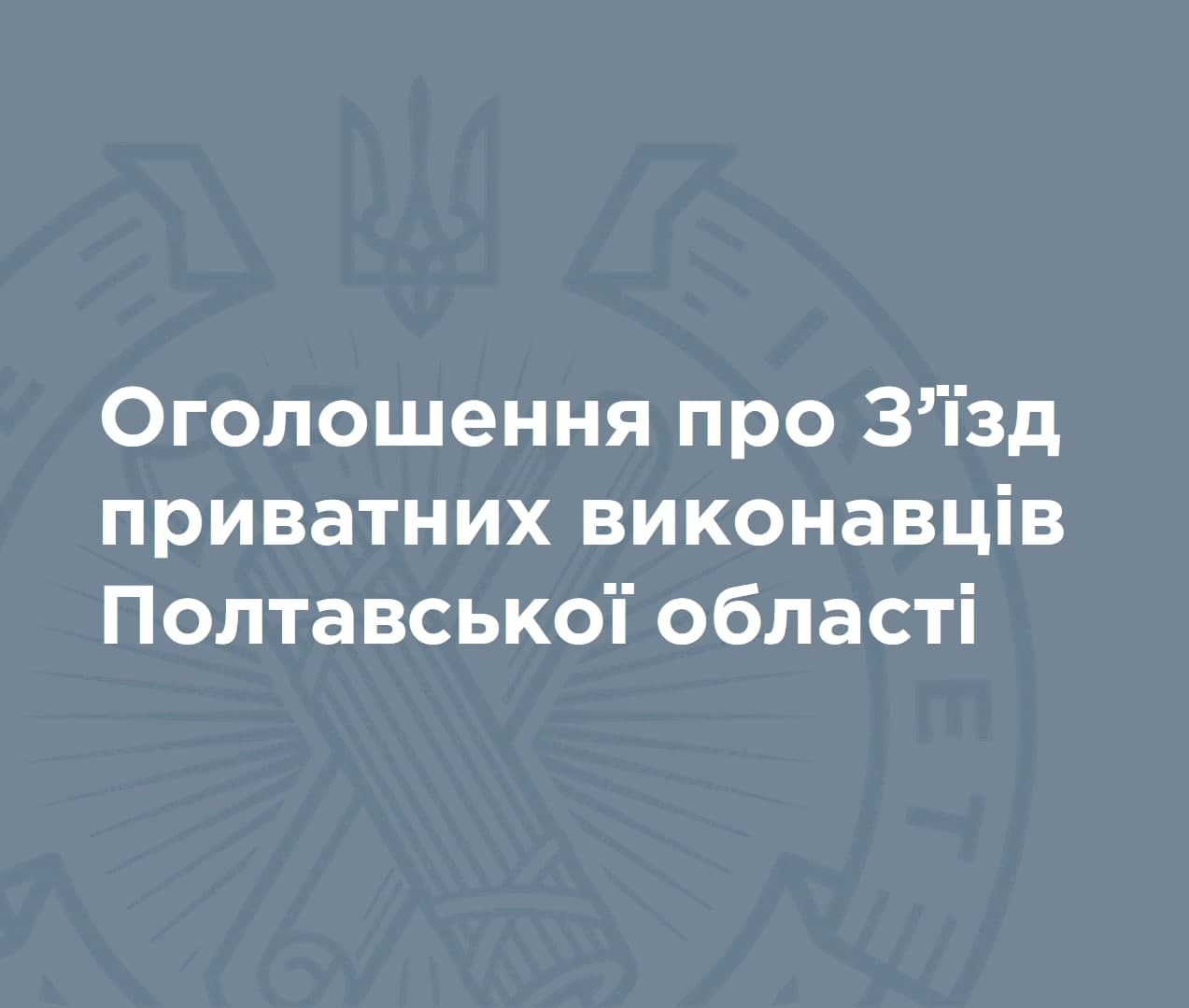 Оголошується З’їзд приватних виконавців Полтавської області, скликаного Радою приватних виконавців Полтавської області. З’їзд відбудеться 23 жовтня 2021 року о 10:00 год.. за адресою: м. Кременчук, вул. Троїцька. 89-А (офіс приватного виконавця Скрипника В.Л.).