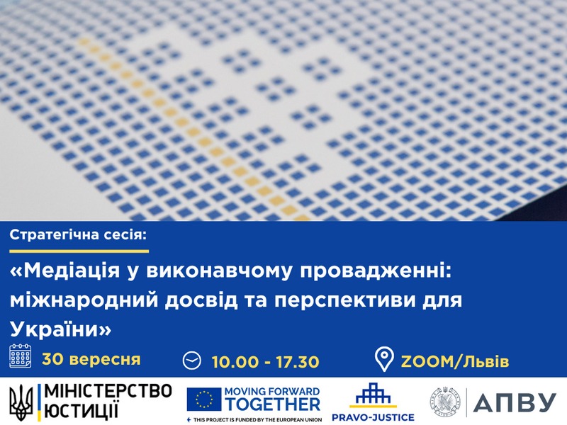 30 вересня 2022 року у м. Львові Проект ЄС “Право-Justice” проведе стратегічну сесію на тему «Медіація у виконавчому провадженні: міжнародний досвід та перспективи для України». У заході також можна взяти участь онлайн: