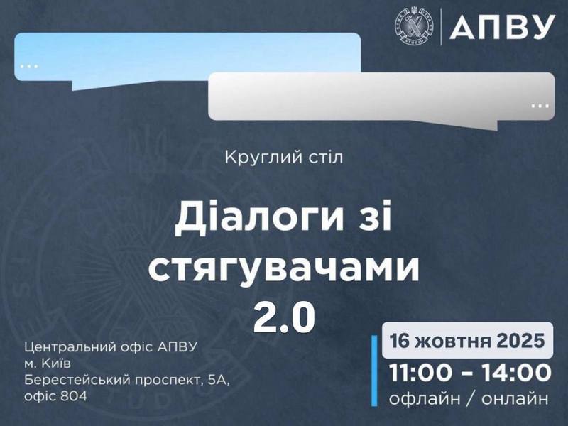 16 жовтня 2025 року об 11:00-14:00 відбудеться круглий стіл «Діалоги зі стягувачами 2.0» у змішаному форматі (офлайн та онлайн).