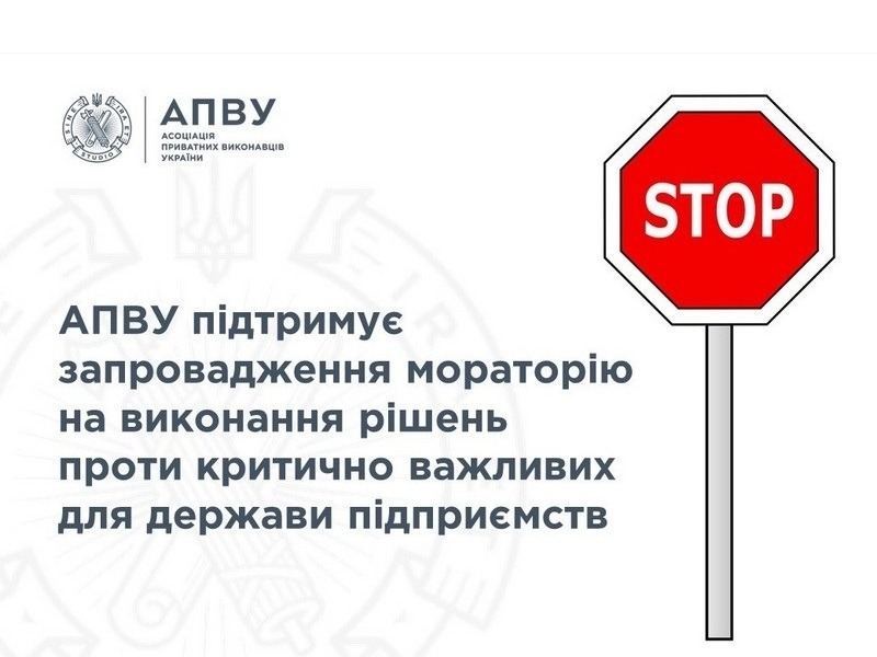 Асоціація приватних виконавців України підтримує запровадження мораторію на виконання рішень проти критично важливих для держави підприємств.
