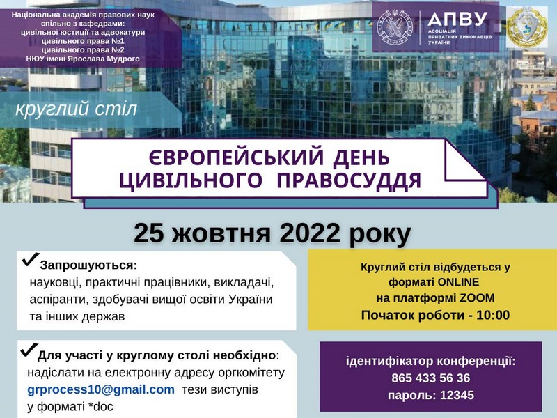 25 жовтня 2022 року Кафедра цивільної юстиції та адвокатури Національного юридичного університету імені Ярослава Мудрого спільно з Асоціацією приватних виконавців України проведуть в онлайн-форматі ZOOM круглий стіл “Європейський день цивільного правосуддя”.